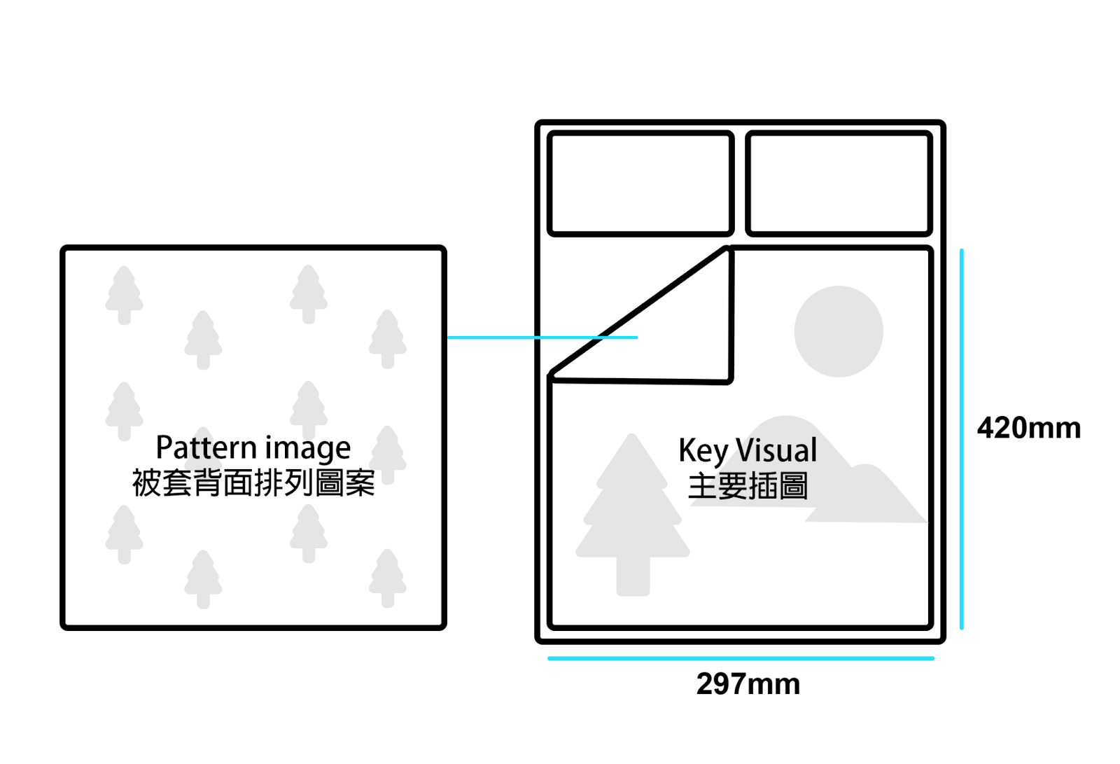 Resolution: Size of two A3 size images, 350dpi or above, the former as the main illustration, and the latter as the pattern for the back of the blanket (as shown in the diagram)